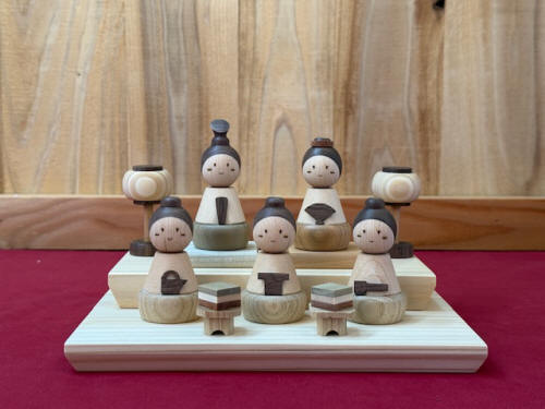 また、使用している接着剤も、口に入れても安心なものを使用しており、三人官女の持ち物まで細かい寄木の技術が施されています。顔が命とも言われるお雛様ですが、お子様の成長を見守る優しく愛らしい表情に仕上げており、木のナチュラルな質感とシンプルながら愛らしい造形で、若いご家族の暮らしに馴染むお雛様にいたしました。